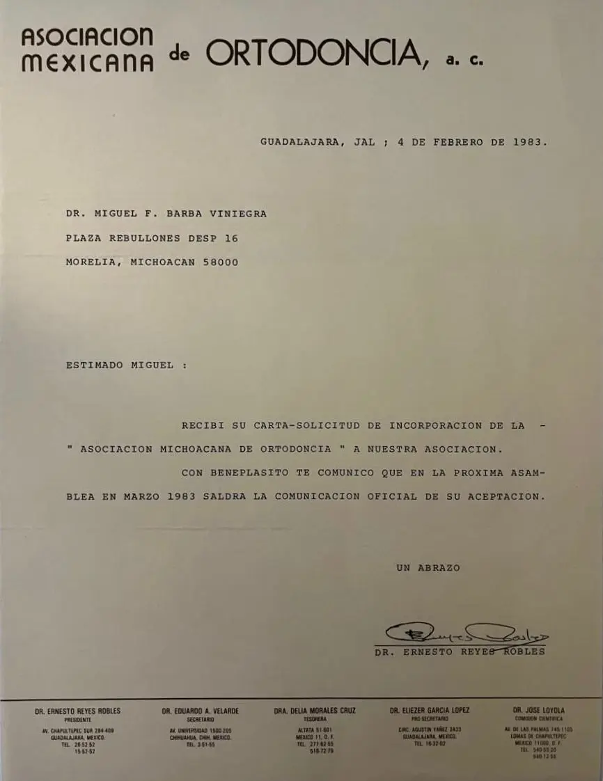 Como parte de su consolidación institucional, el 22 de enero de 1983 se envió una solicitud formal al Dr. Ernesto Reyes Robles, presidente de la Asociación Mexicana de Ortodoncia, para integrarse a dicha federación. La respuesta favorable se recibió el 4 de febrero de 1983, logrando así su incorporación oficial.