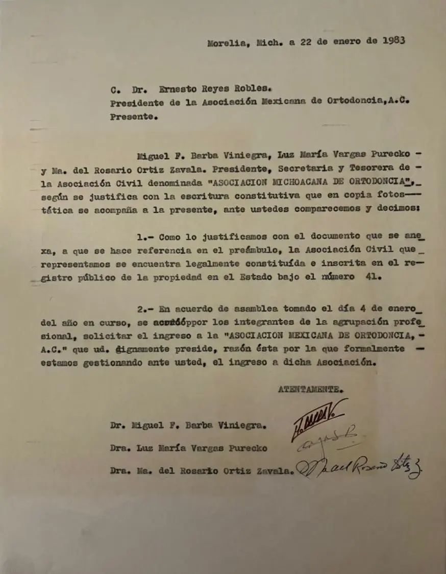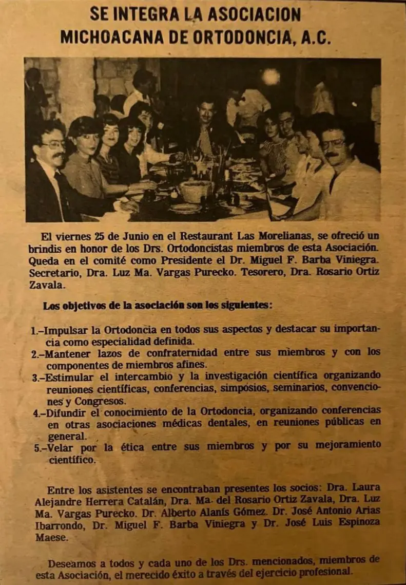 En ese encuentro se formalizó la fundación de la Asociación Michoacana de Ortodoncia A.C., siendo designado como su primer presidente el Dr. Miguel Fermín Barba Viniegra.